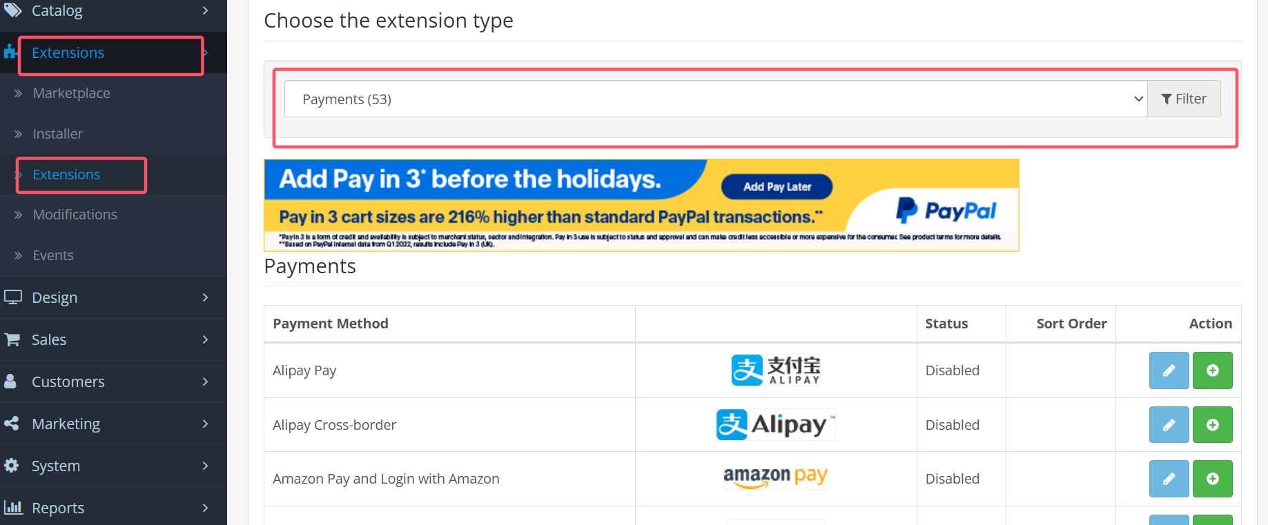 登錄 OpenCart 后臺,進(jìn)入 “擴(kuò)展> 擴(kuò)展 > 支付方式”,找到 “我的支付插件”,點(diǎn)擊 “安裝”,然后點(diǎn)擊 “編輯” 配置訂單狀態(tài)等參數(shù),最后啟用插件。